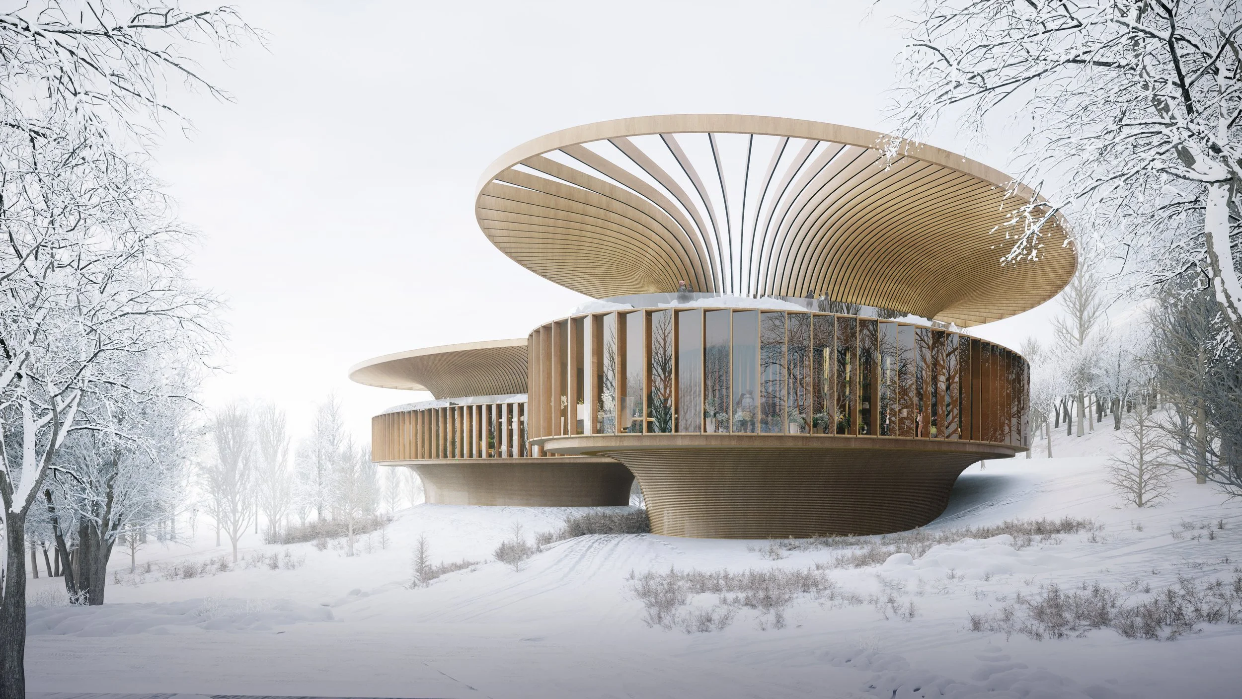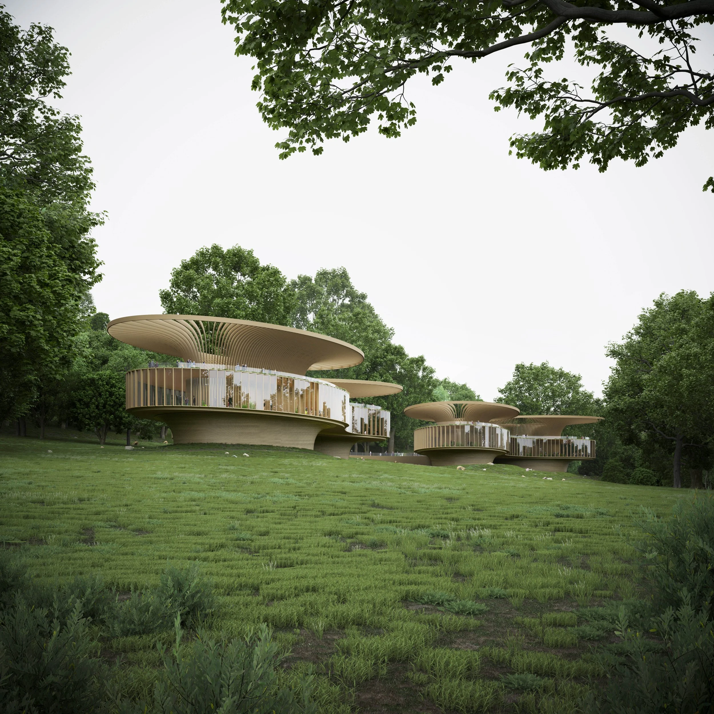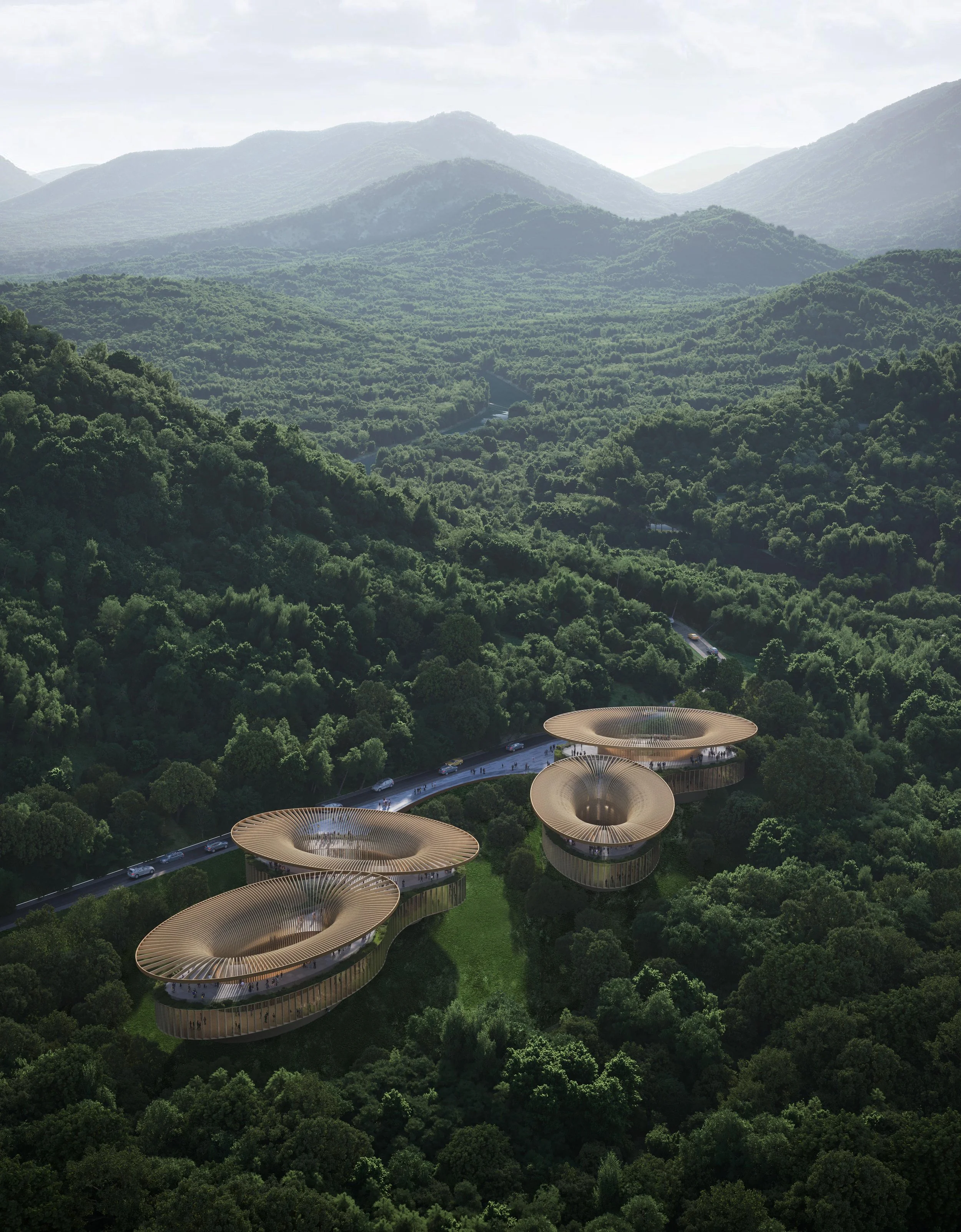 枯桃花卉市场四周青山环绕,景色独特。该项目尽可能减少土地挖掘,以减小对环境的影响。像花朵一样生长的四个有机体量自山坡上生长而出。木材和铝制结构与自然景观无缝融合。遮蔽在花冠形结构下的屋顶露台可以360度全方位欣赏周围的景色。花冠形结构还有助于收集雨水,使建筑更具可持续性。