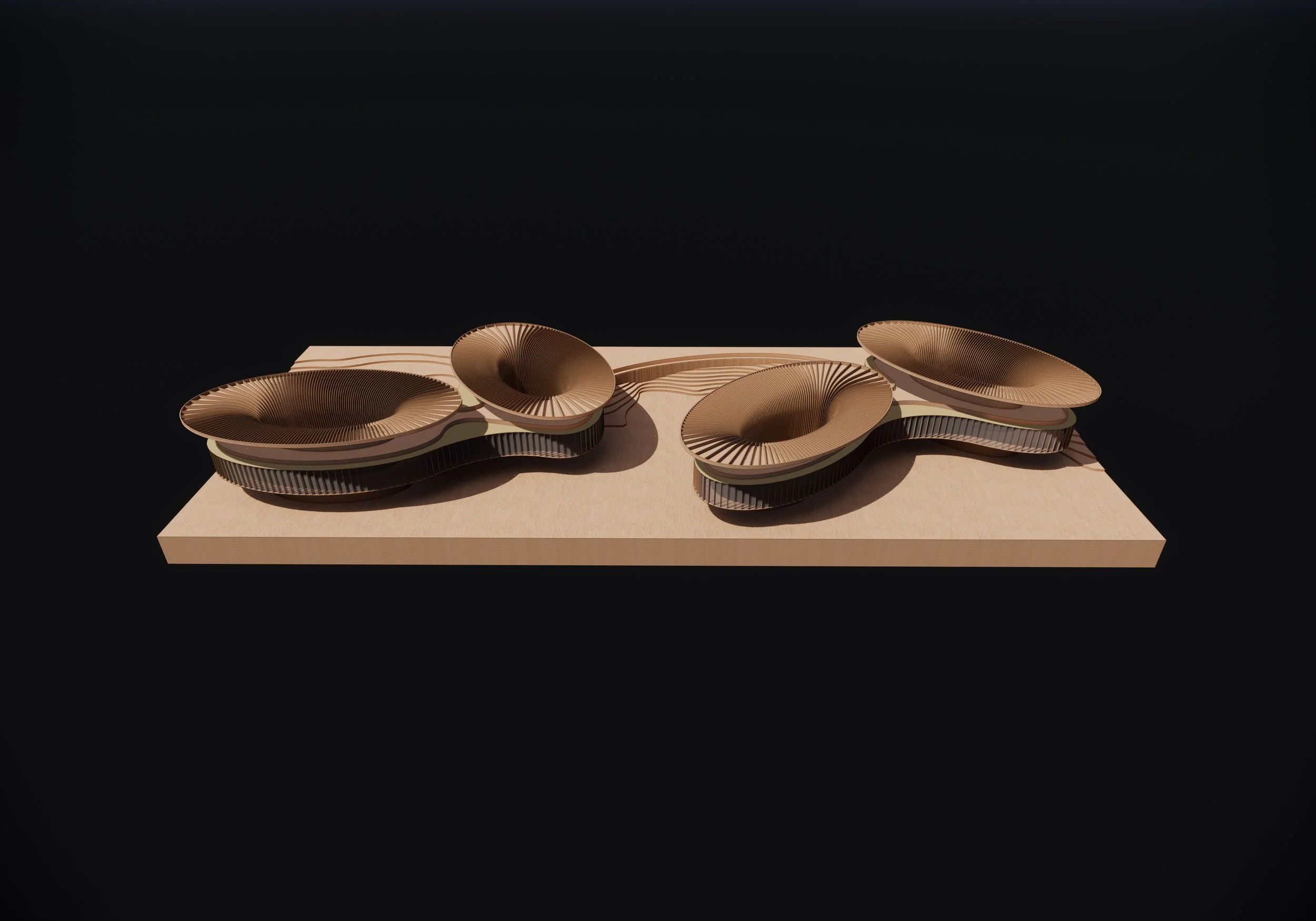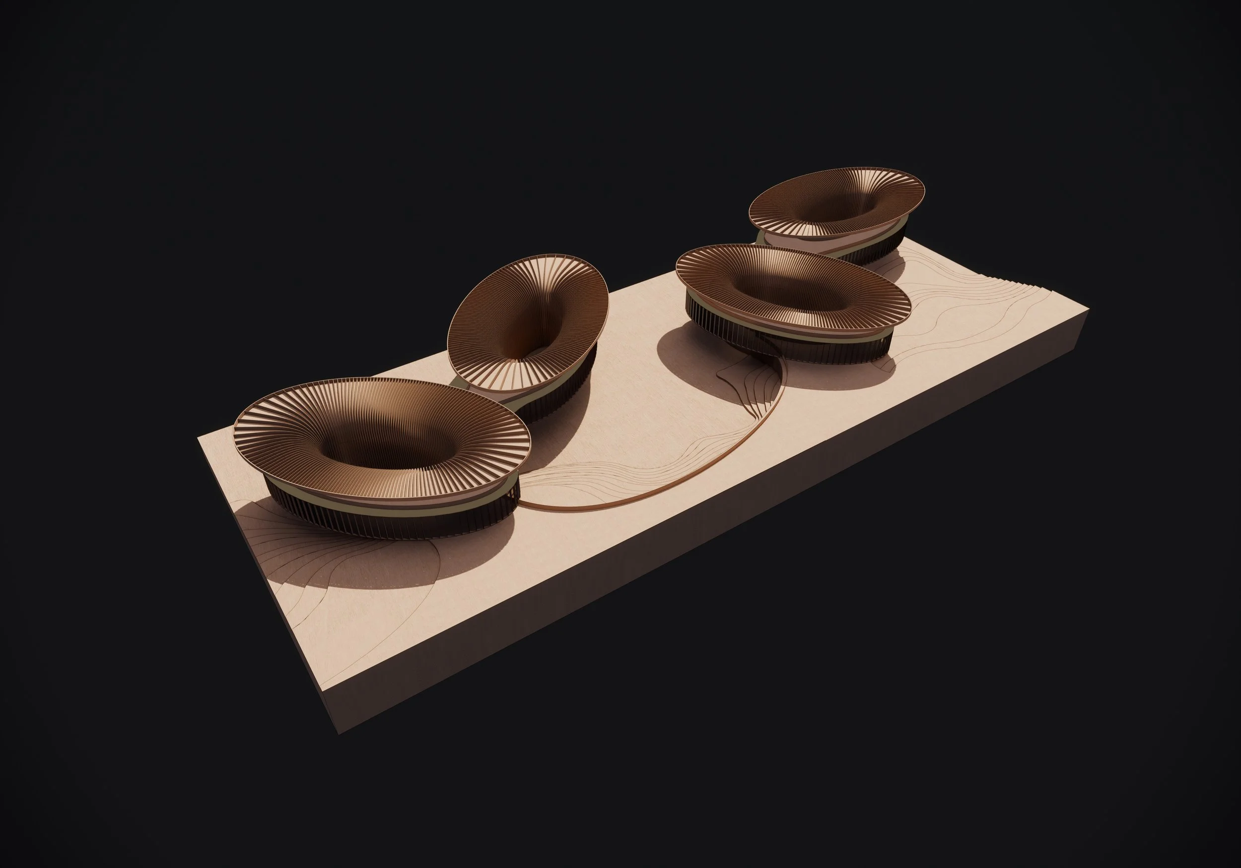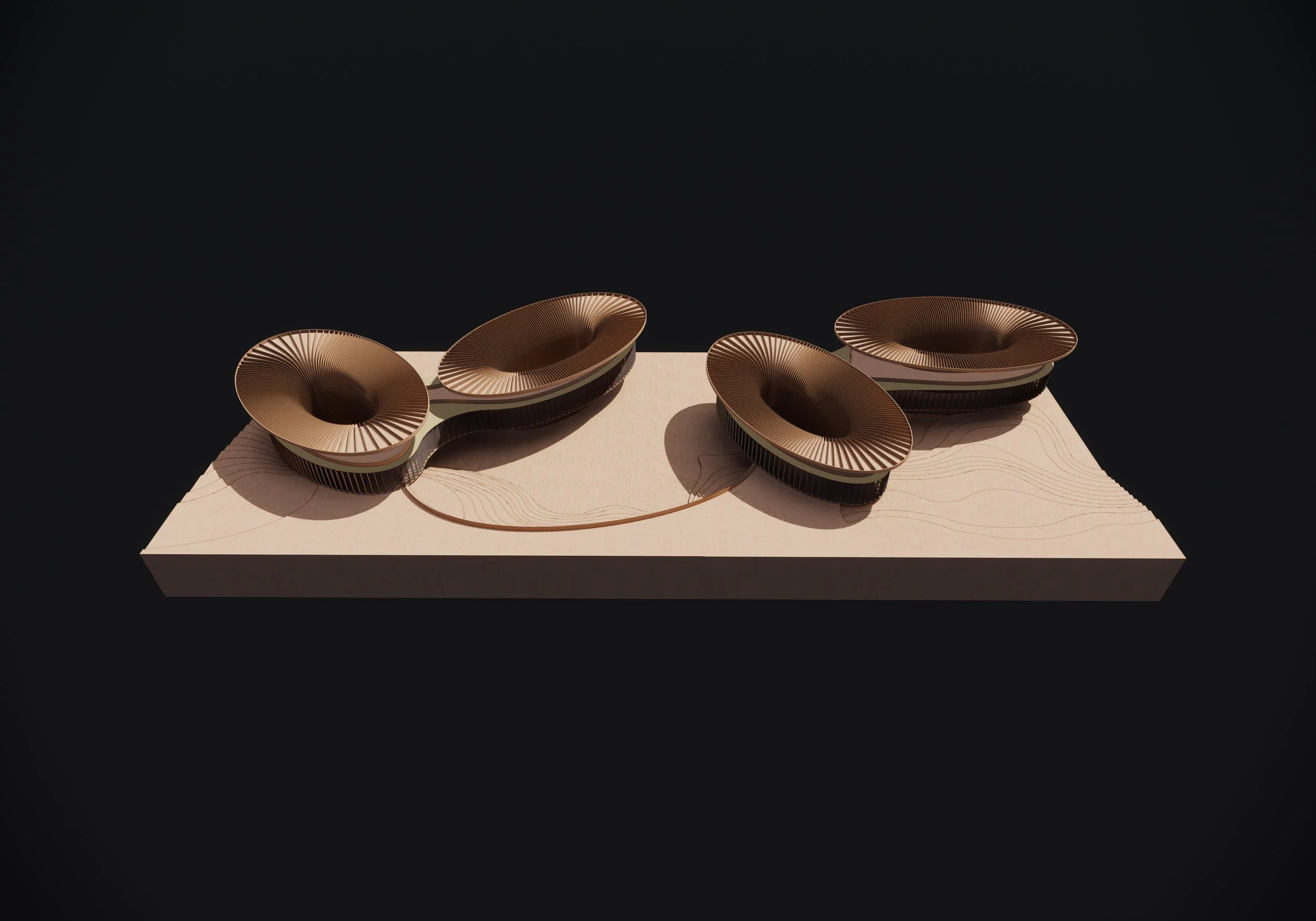 枯桃花卉市场四周青山环绕,景色独特。该项目尽可能减少土地挖掘,以减小对环境的影响。像花朵一样生长的四个有机体量自山坡上生长而出。木材和铝制结构与自然景观无缝融合。遮蔽在花冠形结构下的屋顶露台可以360度全方位欣赏周围的景色。花冠形结构还有助于收集雨水,使建筑更具可持续性。