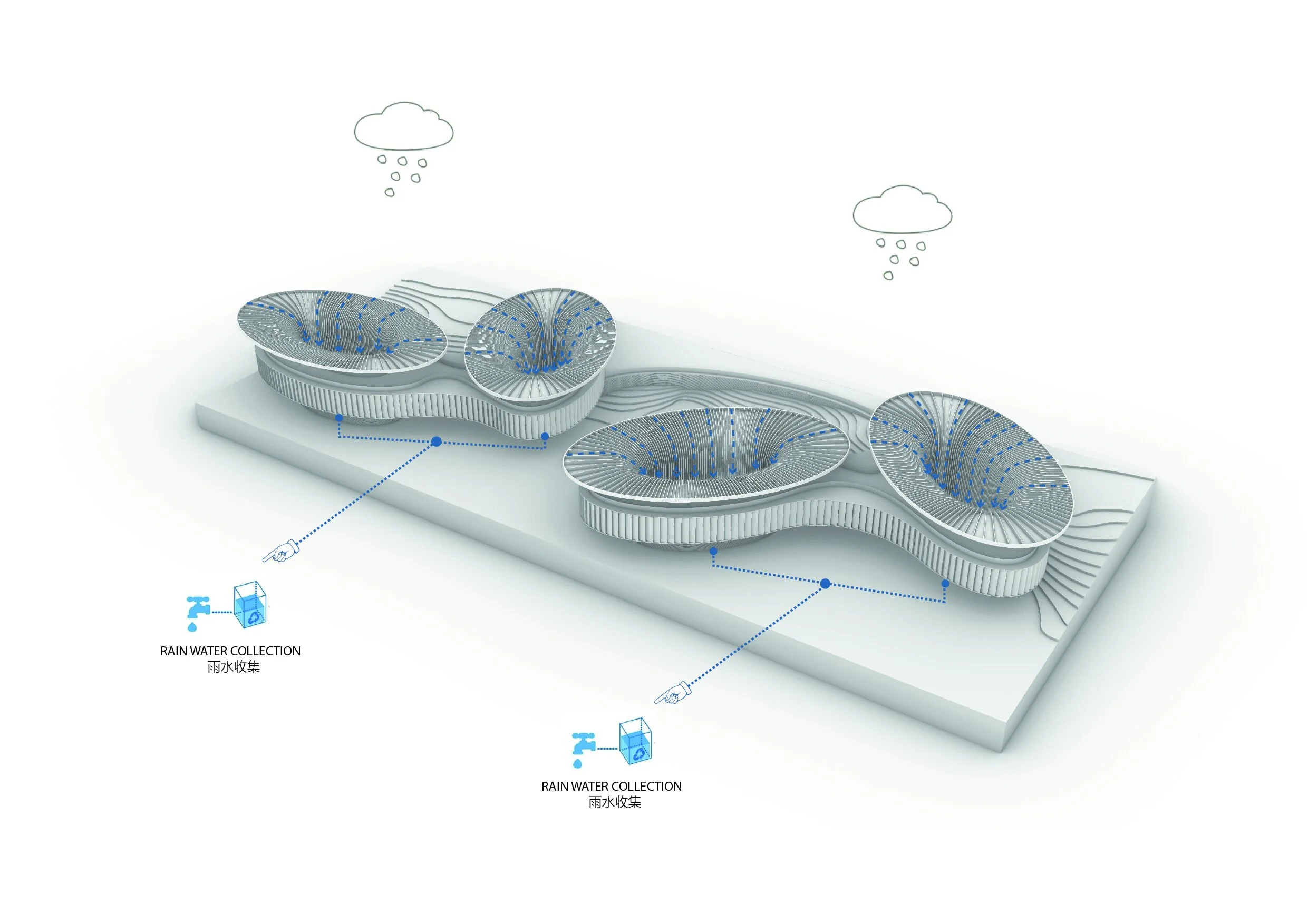 The visitors are firstly greeted by the corolla-shaped canopies. The timber-and-aluminum canopies growing from the slope of the mountain, integrated seamlessly into the natural landscape. The roof terraces that sheltered under the canopies has 360 degree panoramic views to the surrounding. They are used not only for flower trading but also community gathering and culture exchange. The canopies also helps in rain water collection, which makes the building more sustainable.
