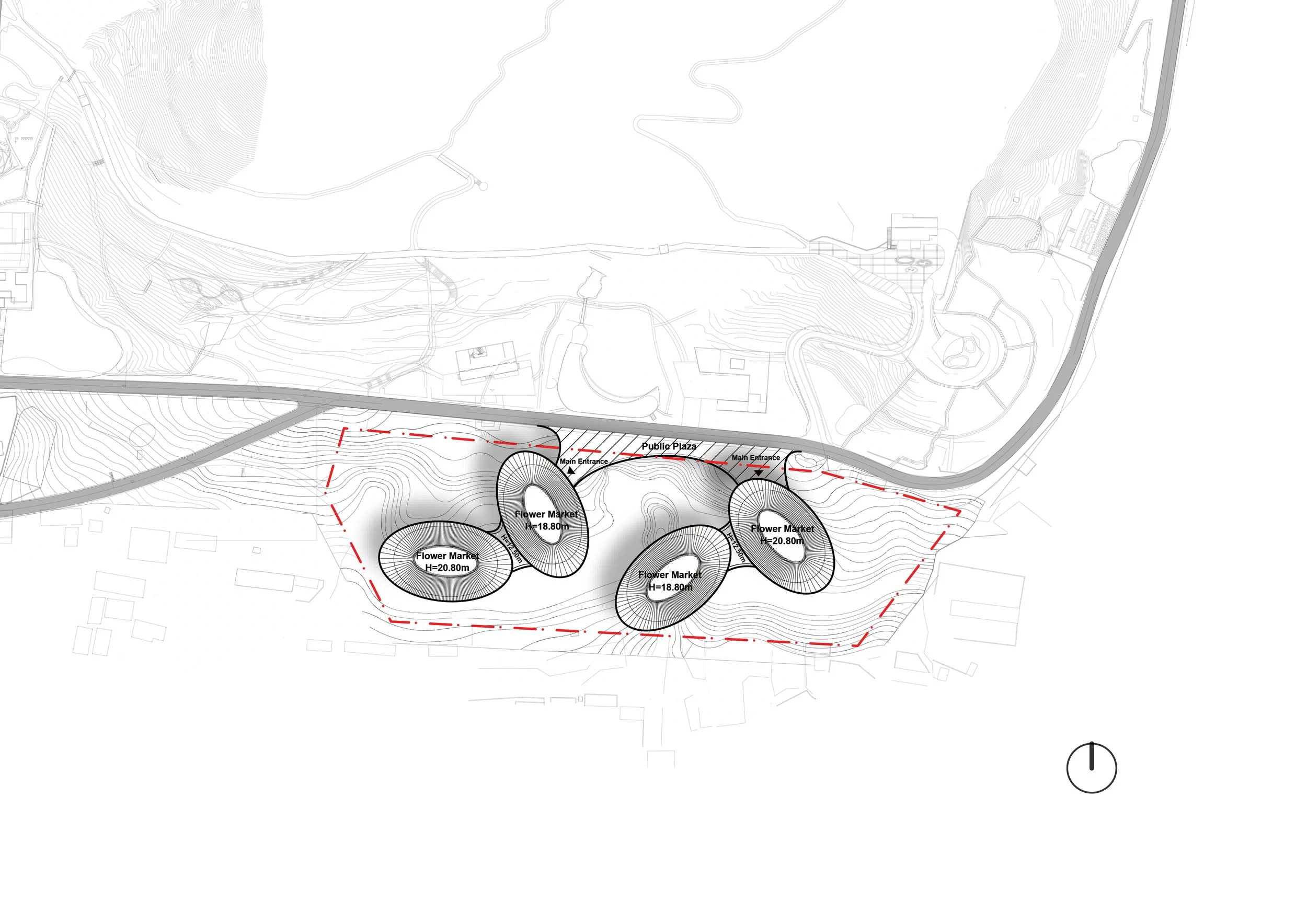 Surrounded by green-covered mountains, the Kutao Flower Market enjoys unique scenery. In order to minimize its environmental impact, the project aimed to reduce land cutting as much as possible. The resulting design is four organic volumes growing from the hillside like flowers.