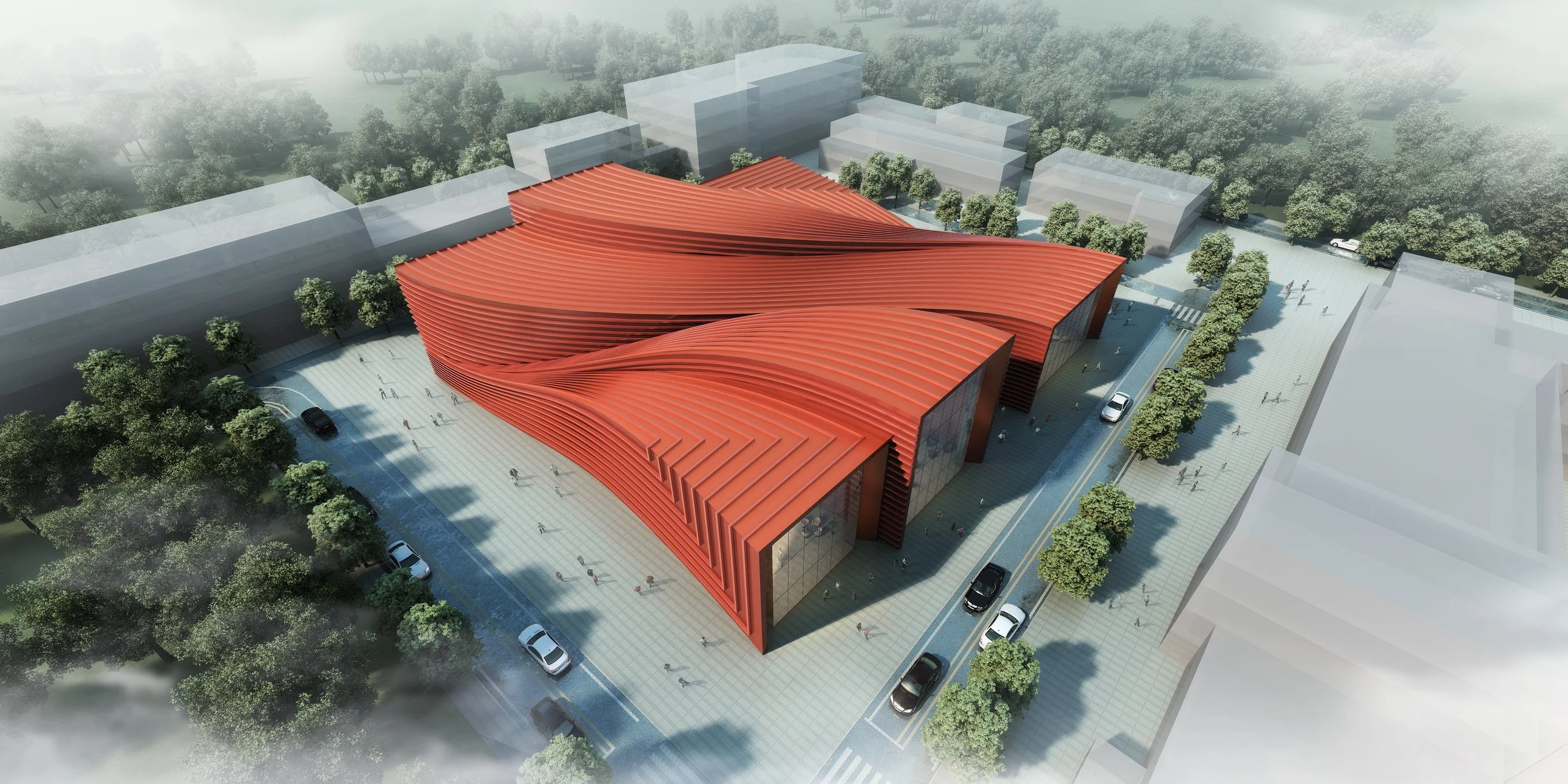 橡胶,作为青岛传统工业的代表, 在青岛发展史上有着举足轻重的地位. 由橡胶高弹性的特性中亟需灵感, 该项目由一系列条形体量组成通过简洁流畅的线条融合为一, 还原了橡胶受到外力而产生的形变的过程,是用现代建筑语言对橡胶特性进行的独特转译与诠释.漫步其中,参观者通过与建筑造型呼应的流畅的流线,回顾橡胶工业的发展历史,展望其辉煌的前景.