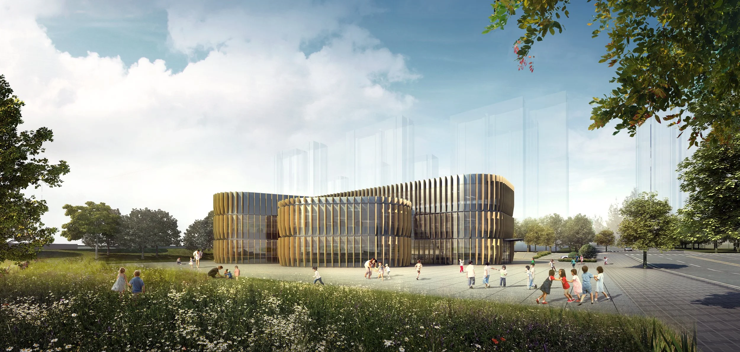 建筑体量来源于一系列的分割、旋转、挤出过程,最终形成一个花瓣形的体量.在立面上,以木质装饰条,营造出亟待绽放的花朵的形态,减少了钢筋水泥的冰冷感,清除了孩子们对于幼儿园的陌生和怀疑.