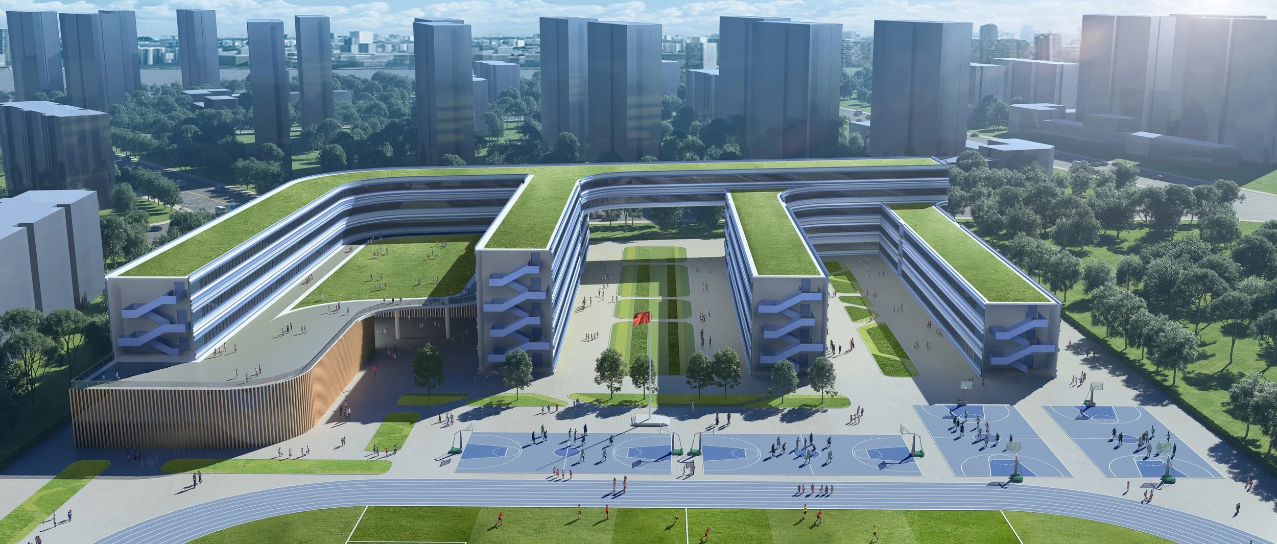 整体建筑包含九个分支,由一条纵穿南北的主轴线像一条纽带般串联起来,36班小学部位于整座建筑北侧,18班中学部位于整座建筑的南侧.小学部与初中部流线区分明确,又由位于一层与五层的中小学共享教学空间融合在一起.既使学生可以专注于各自的课程,便于管理,又鼓励了跨年级与年龄的学习交流.